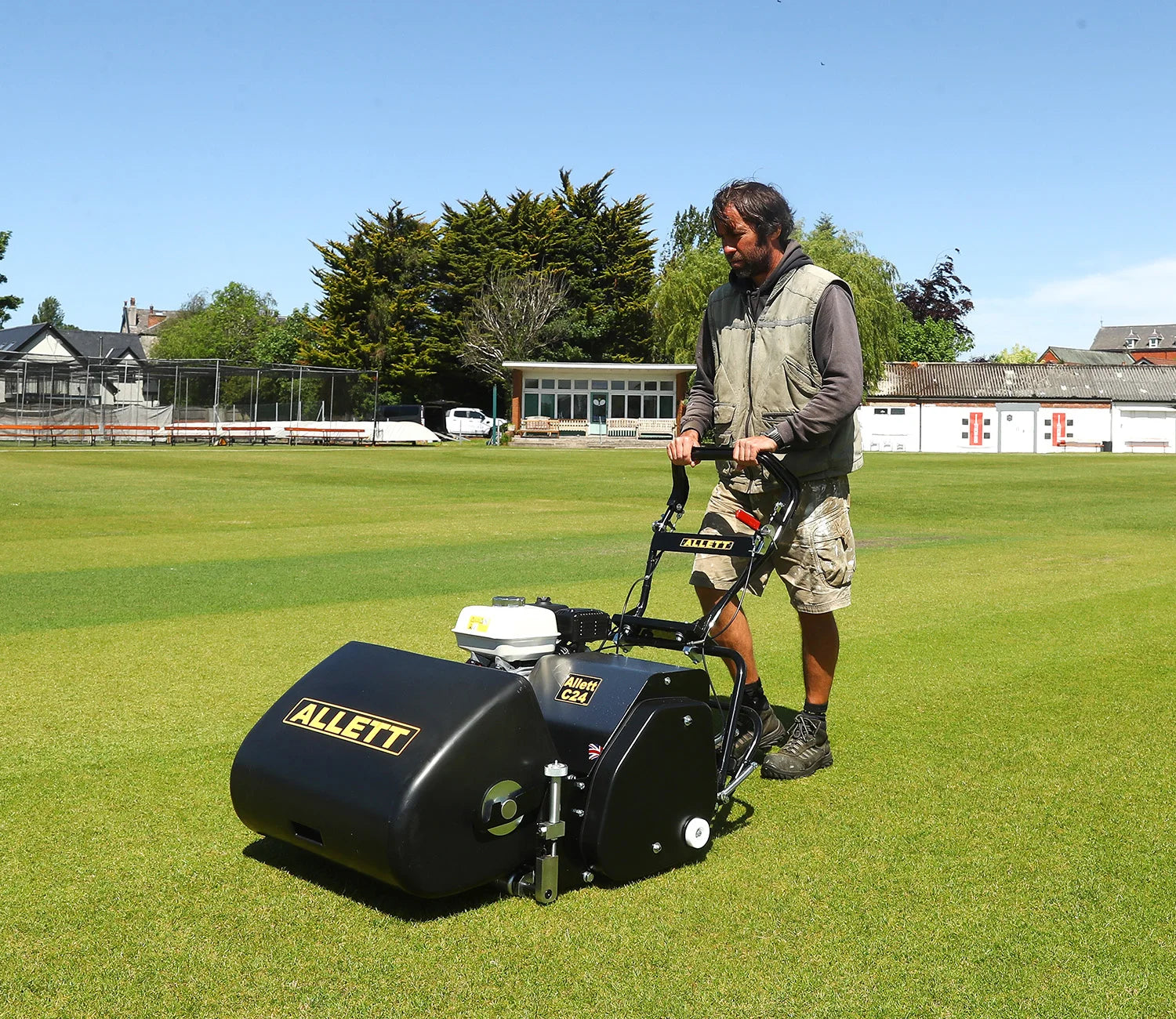 The Allett C24 is ideal for cricket wickets, greens, and low-cut lawns due to its precision cutting (2.4–19mm), interchangeable turf care cartridges, professional-grade Honda engine, and stable roller-based design—delivering a clean, consistent finish and year-round versatility for fine turf maintenance.