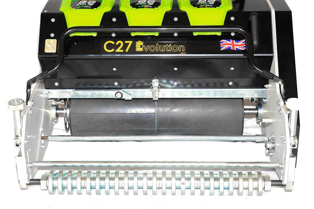 The C27E features a rubberised rear roller with steel differential gears and a grooved front roller. This combination ensures excellent striping, smooth operation, and even weight distribution for a professional-quality finish.