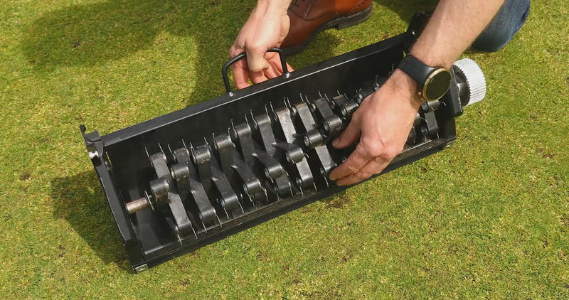 The rotating spring tines are relatively gentle on the lawn and this cartridge can be used most of the year without fear of damage to keep on top of thatch levels as well as being useful to collect up leaves during the autumn. The use of the spring tine allows for safe cultivation where tree roots may be close to the surface. This is the best cartridge for beginners to turf cultivation as it is unlikely to cause damage if set too deeply but will give great results if used regularly.