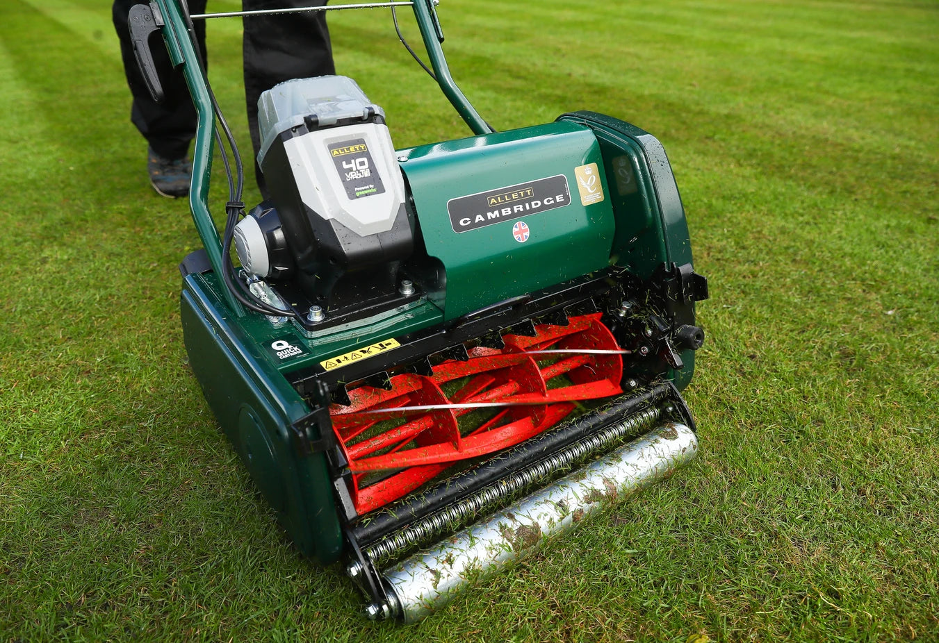 Powered by a 40v Lithium-Ion battery it has infinitely variable micro-cutting height adjustment ranging from 1/4 inch to 1 1/4 inch (6mm-32mm). The height of cut dial is shown in mm instead of 1,2,3,4 like on our Kensington model. The Cambridge 43 takes ALL the RC43 cartridges in the Allett range for additional lawn care tasks.