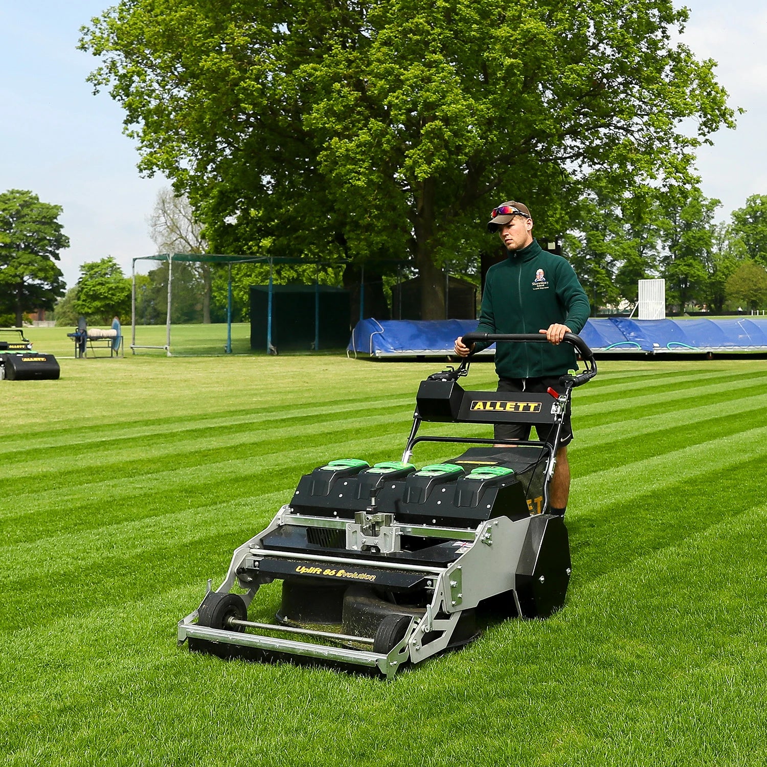 The Allett Uplift 86 is ideal for football and rugby pitches, with twin blades and a strong vacuum to lift debris after matches. Its 86 cm cut, full-width rear roller, and 90L collector deliver fast, striped, professional results on large turf areas.